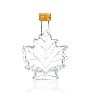 A decorative beverage bottle with a distinctive maple leaf silhouette, made from clear standard glass. Its transparent design and golden cap create a premium, visually appealing presentation. |