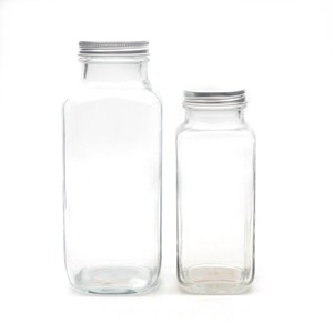 A classic square-shaped beverage bottle made of clear, ordinary glass. Designed for excellent content visibility and a premium feel, it is available in multiple sizes. This specification covers the 500ml large version. The bottle features a standard metal screw-on cap for a secure and leak-proof seal. |