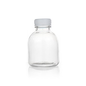 A classic, clear glass bottle designed for beverages. Features a rounded body, a slightly narrowed neck, and a secure screw-on cap for a clean and practical presentation. |