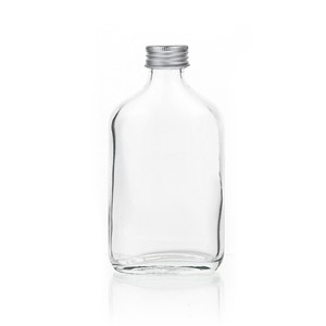 A 200ml glass beverage bottle crafted from clear, standard glass. It features a simple and elegant design with a slightly rounded rectangular shape, making it ideal for premium beverage packaging. |