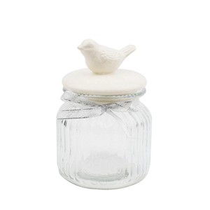 This elegant glass storage jar is designed to combine functionality with charming aesthetics. Equipped with a ceramic lid adorned by a delicate bird-shaped ornament, it not only ensures secure storage but also adds a touch of whimsical charm to your home or kitchen.