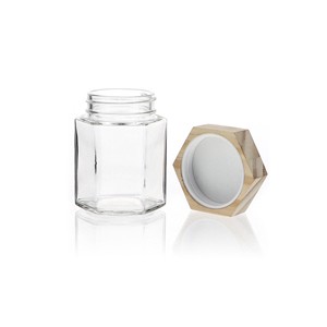 This product is a clear glass jar with a hexagonal body, designed for versatile applications in the food, cosmetic, and storage sectors.