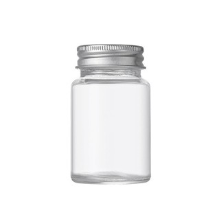 A clear, cylindrical glass bottle with a metal screw cap, designed for general-purpose storage and packaging. |