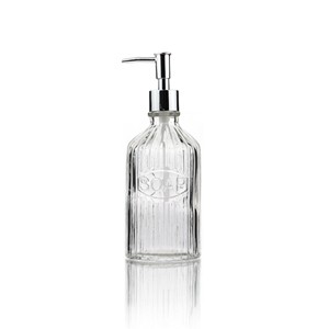 This sophisticated soap dispenser features a clear glass body and a durable metal-plated pump. With a generous capacity, it is designed for both functionality and modern aesthetics. The word "SOAP" is elegantly embossed on the front, making it a stylish addition to any sink area. |