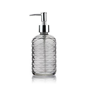 An elegant and durable glass soap dispenser featuring a textured wave design and a metallic silver pump, designed for both functionality and modern aesthetics. |