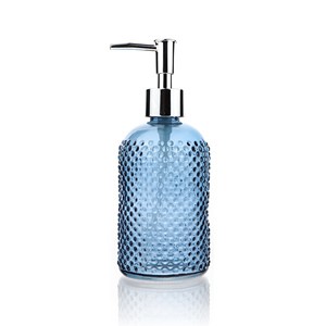 A elegant and functional soap dispenser crafted from clear glass with a textured dot pattern. Features a durable stainless-steel pump head for smooth, one-handed operation. Its minimalist design makes it a perfect fit for any modern bathroom or kitchen. |